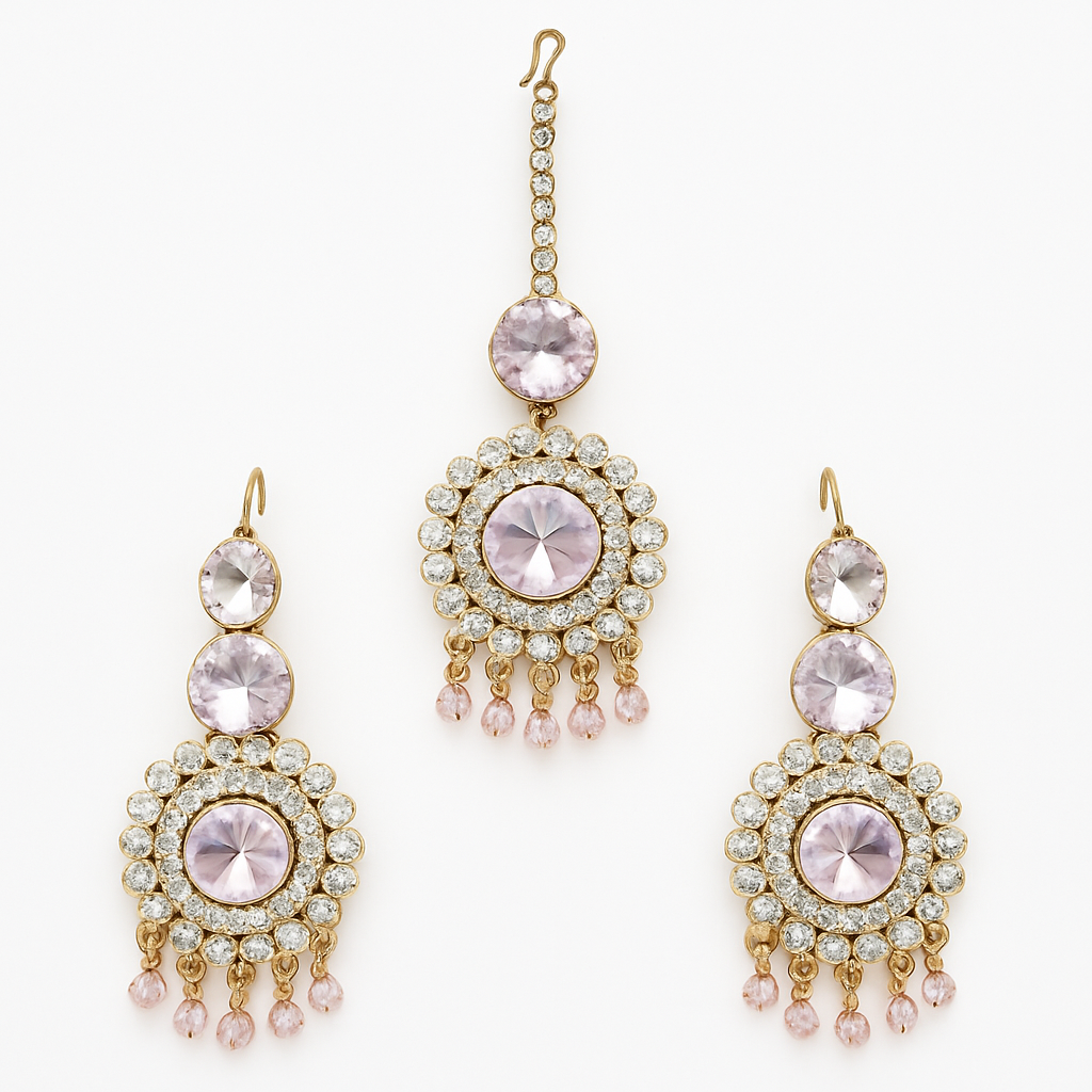 This stunning maang tikka and earring set blends traditional Indian design with modern craftsmanship. Featuring a rose gold-plated base, the central element is adorned with sparkling American diamonds in a circular motif, highlighted by elegant lavender stones and delicate pink bead danglings. Ideal for weddings, festivals, and special occasions, this set is lightweight, skin-friendly, and finished with intricate detailing to complement any outfit—whether it’s a classic lehenga or a contemporary saree. Handcrafted by expert artisans, this jewelry set adds a regal and sophisticated touch to your personality and style.