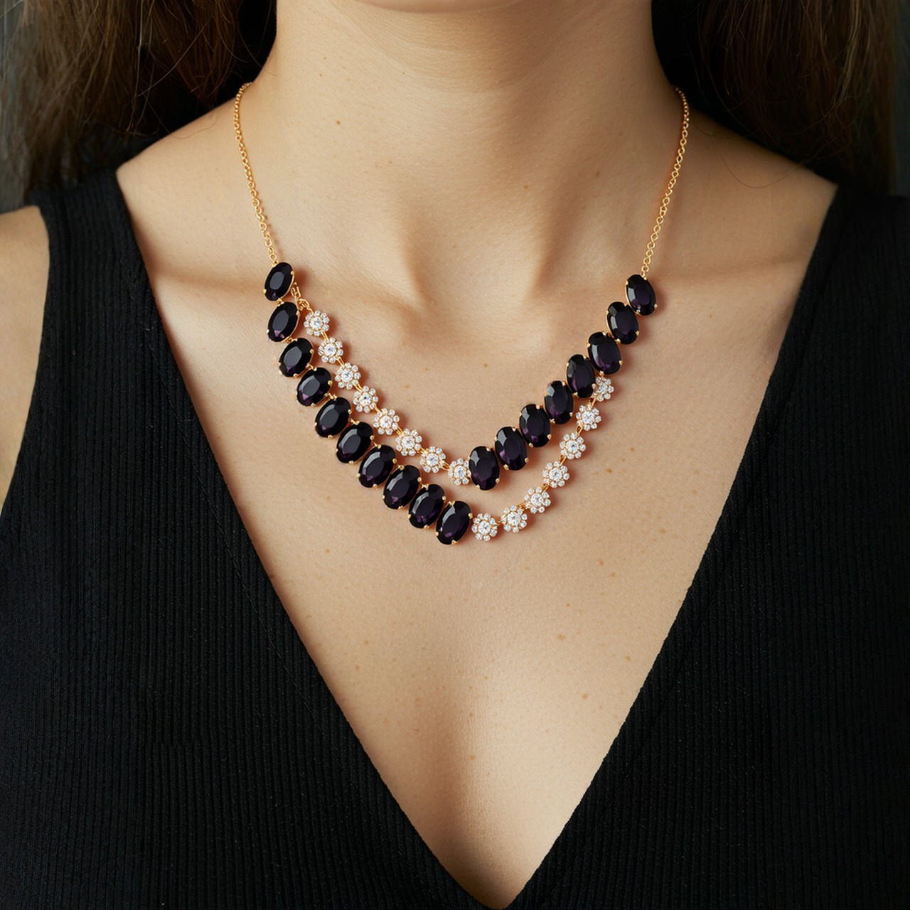 Elevate your style with this luxurious black stone necklace set with matching earrings from Safa Glame. Featuring bold oval-cut black stones set in a golden frame, the necklace exudes sophistication and charm. The design is further enhanced with sparkling crystal flower motifs that add a dazzling touch of elegance.